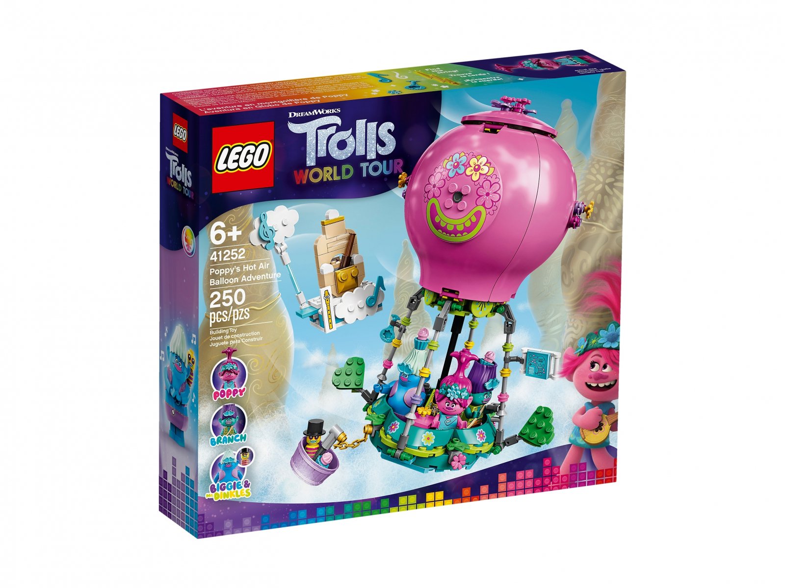Podaruj dzieciom zestaw LEGO® Trolls World Tour Przygoda Poppy w balonie — niezwykła podróż z trollami doda skrzydeł ich wyobraźni! Zestaw pozwala połączyć odkrywanie minifigurek trolli oraz licznych funkcji i akcesoriów z odtwarzaniem scenek z filmu lub wymyślaniem własnych opowieści. Niesamowity zestaw i epicka opowieść o trollach Zestaw z zabawkowym pojazdem zawiera trzy minifigurki (i dodatkowo figurkę Pana Dinklesa), więc zabawa może się rozpocząć z chwilą otwarcia pudełka. W pudełku czeka mapa i lornetka, które pomogą w nawigowaniu, a także klapy w kształcie serca, do manewrowania. Dzieci będą mieć masę radości, kierując balon w stronę Symphonyville — zupełnie jak Poppy, Branch i ich filmowi kumple! Zabawki z serii LEGO Trolls World Tour otworzą drzwi do świata kreatywnej zabawy przed wszystkimi fanami filmów DreamWorks o trollach. Ożyw świat filmowych trolli! Zestawy konstrukcyjne zawierają kolekcjonerskie akcesoria oraz zabawne zdejmowane włosy. Budowa różowego balonu na ogrzane powietrze będzie jeszcze lepszą zabawą dzięki instrukcjom Instructions PLUS z interaktywnymi narzędziami do wyświetlania.