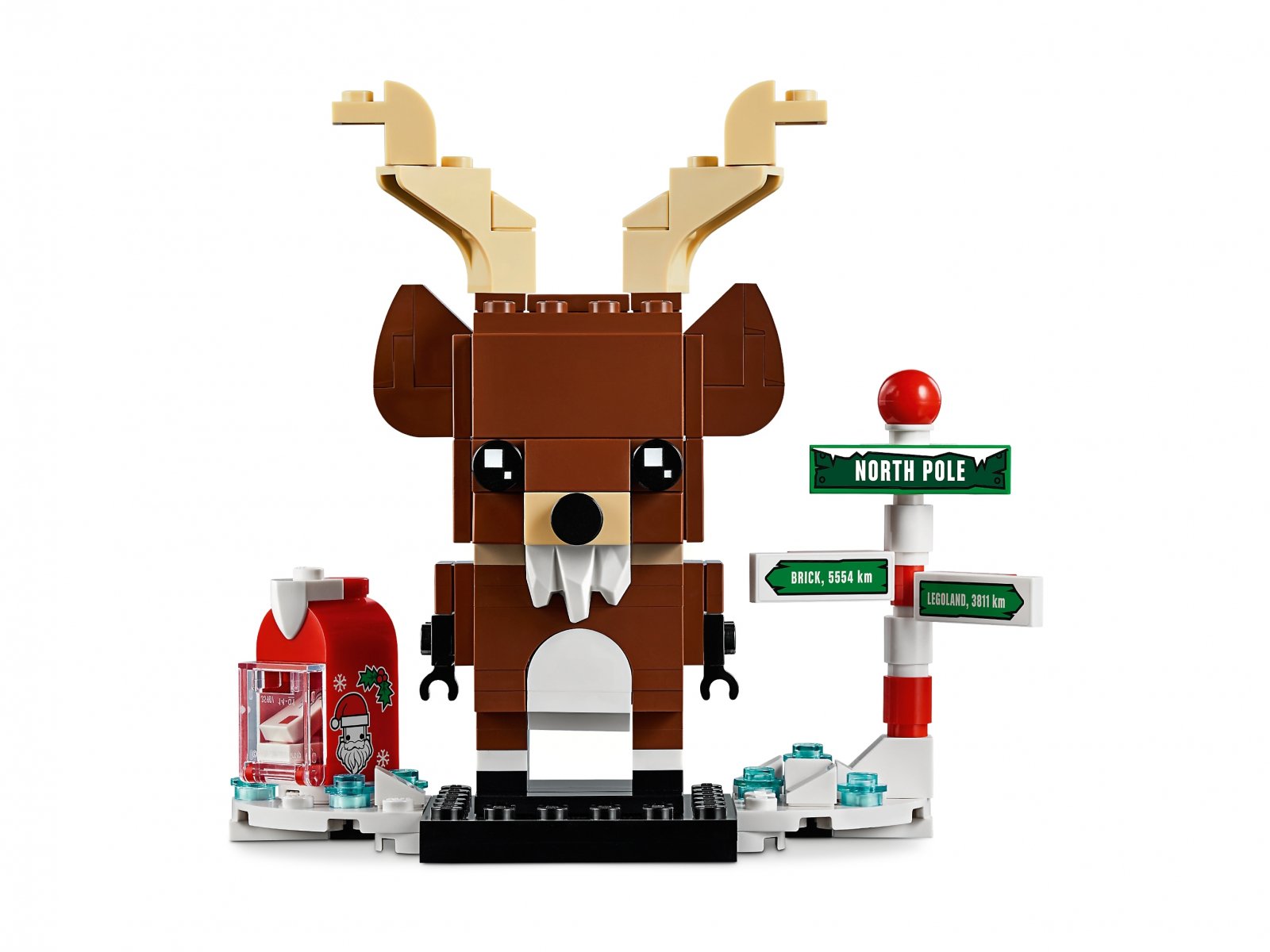 - Na podstawce figurki renifera znajduje się scenka przedstawiająca biegun północny. Drogowskaz wskazuje drogę do parku LEGOLAND® w Billund w Danii oraz do miasta Brick w USA, a w skrzynce pocztowej są dwa listy do Świętego Mikołaja.