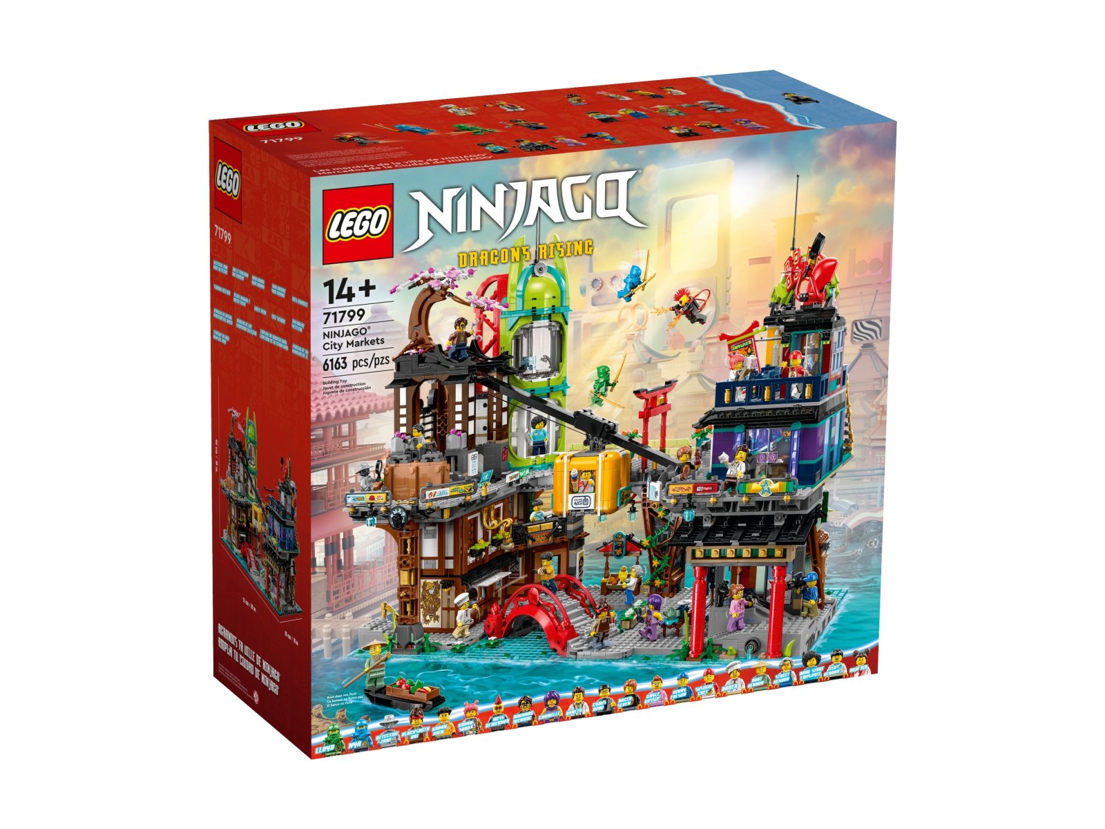 Dzięki temu zestawowi do budowania Rynek miejski NINJAGO® (71799) dzieci w wieku od 14 lat i kolekcjonerzy LEGO® mogą poczuć wyjątkowe emocje i poznać tętniące życiem miejsce, w którym mieszkają i bawią się ninja. Świat największego w historii modelu NINJAGO obejmuje cztery piętra sklepów, restauracji, biur i apartamentów, a także kolejkę linową, windę, łódź, most, a nawet spłukiwaną toaletę.