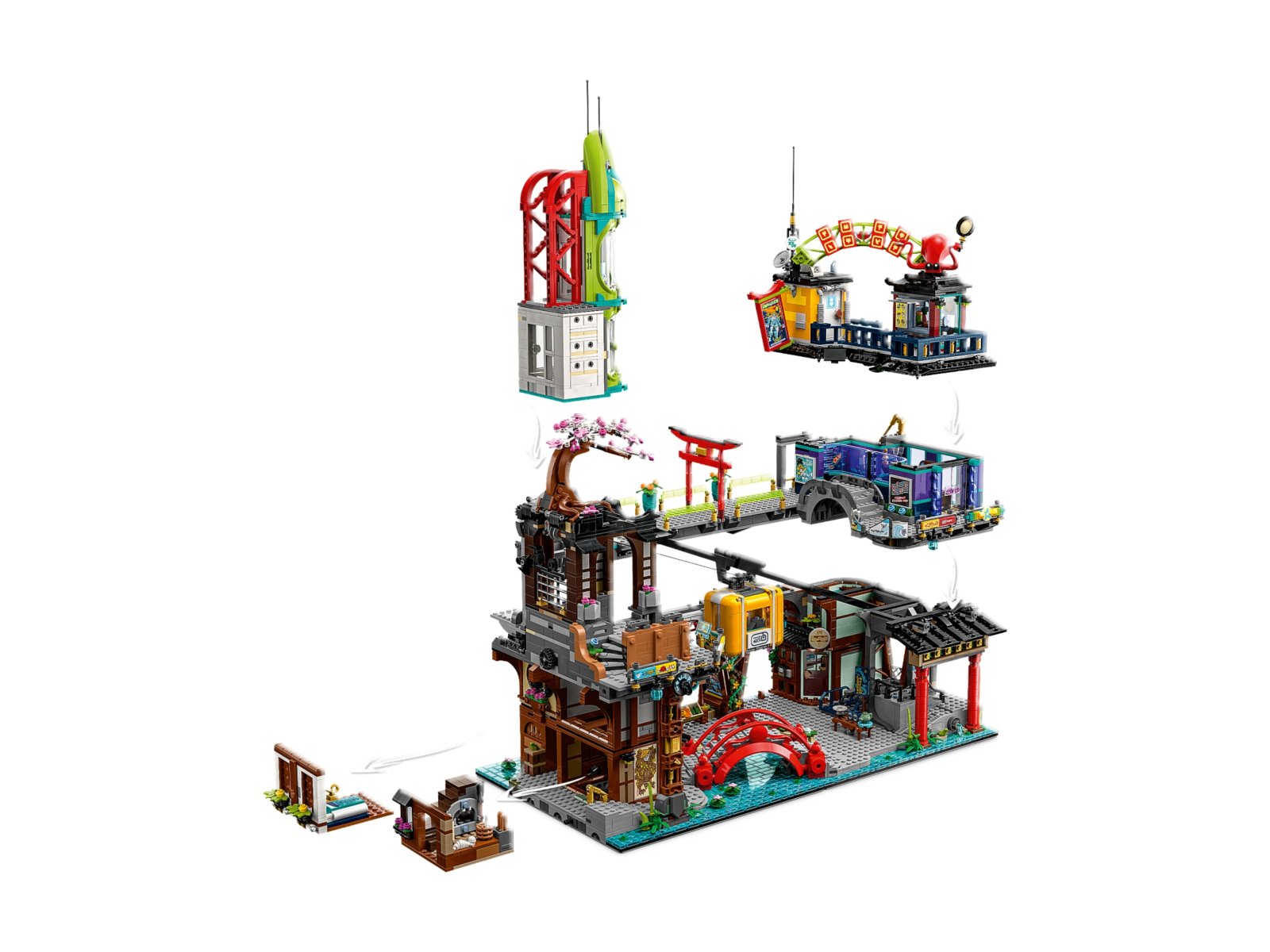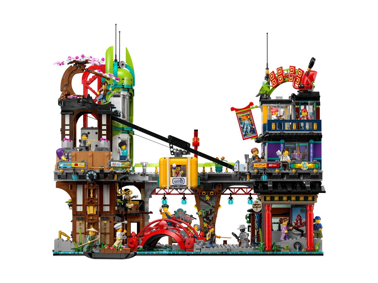 W tym niesamowitym zestawie każdy fan NINJAGO znajdzie coś dla siebie. Jest tam między innymi piekarnia, zakład kowalski, sklep wielobranżowy, sklep Borga, stragany, strefa gastronomiczna na dachu oraz klub karaoke ze stołem bilardowym i sceną. W zestawie jest też 21 minifigurek, w tym wiele lubianych postaci, które jeszcze nigdy się nie pojawiły, więc dzieci mogą odgrywać scenki z serialu telewizyjnego NINJAGO Dragons Rising.