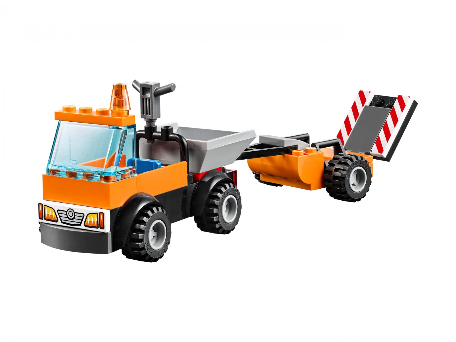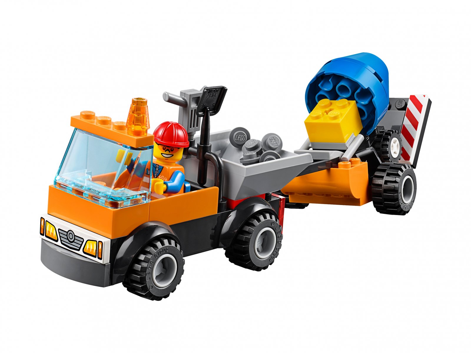 - W zestawie samochód robót drogowych z kabiną dla minifigurki, otwieranym schowkiem na narzędzia z tyłu oraz odłączaną przyczepą z rampą i betoniarką.