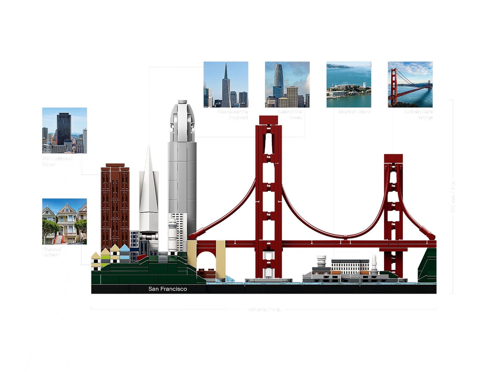 - Zestaw przedstawia najbardziej znane atrakcje San Francisco, takie jak słynne wiktoriańskie domy zwane „painted ladies”, wieżowce 555 California Street, Transamerica Pyramid, Salesforce Tower oraz Coit Tower, Fort Point, most Golden Gate Bridge oraz wyspę Alcatraz.