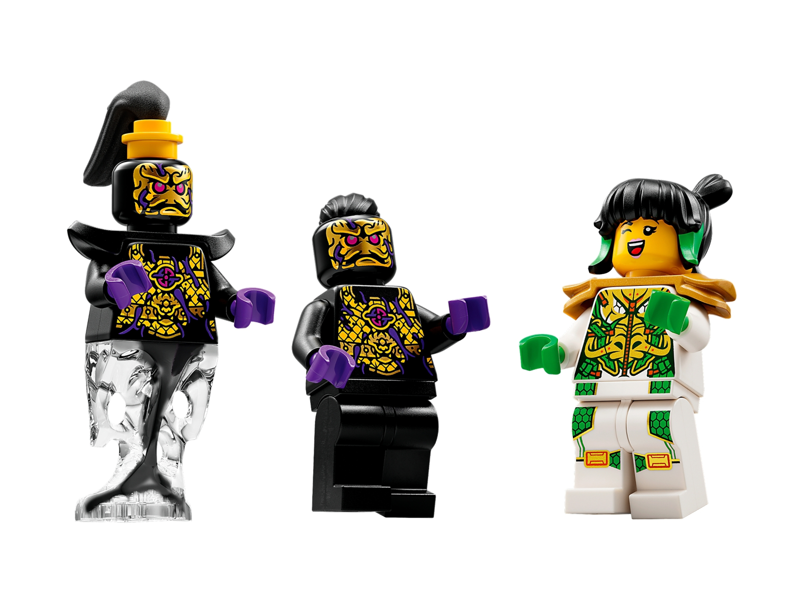 - Trzy minifigurki LEGO® – Mei, Atramentowy Demon i Atramentowy Generał, odrzutowiec Mei w odważnych kolorach, składane skrzydła, odczepiany samolot i dwie wyrzutnie klocków oraz działko generała