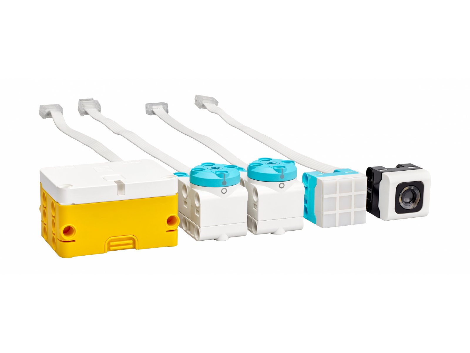 - W komplecie dwa małe silniki, czujnik kolorów, kolorowa matryca świetlna 3x3 oraz inteligentny mały Hub z dwoma portami wejścia/wyjścia, łącznością Bluetooth, 6-osiowym żyroskopem oraz akumulatorem litowo-jonowym wyposażonym w port ładowania i połączenia micro USB.