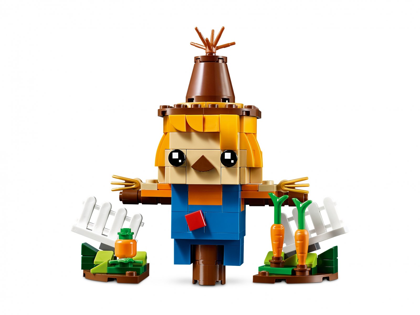- Strach na wróble z serii LEGO® Brickheadz™ do zbudowania z wiejską scenką zawierającą złożoną z klocków dynię, marchewki i biały płotek.