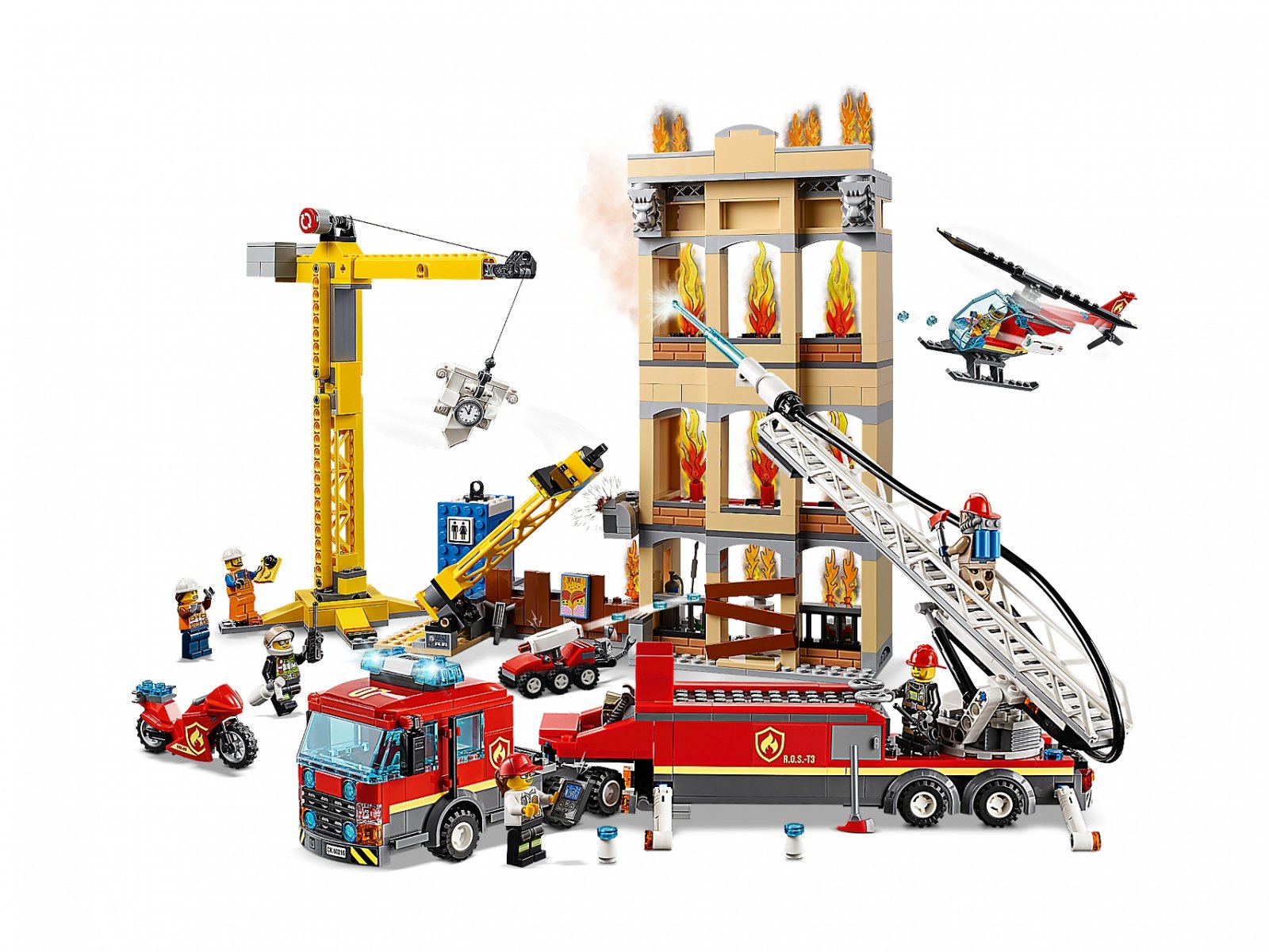 Zadbaj o bezpieczeństwo mieszkańców LEGO® City w niesamowitym zestawie 60216 Straż pożarna w śródmieściu. Znajdziesz w nim duży wóz strażacki z klockiem ze światłem i dźwiękiem (nowość na styczeń 2019 r.), wysuwaną i obracaną drabiną oraz wężem strażackim wyposażonym w pompę z funkcją armatki wodnej (nowość na styczeń 2019 r.). Ten emocjonujący zestaw zawiera też dwupiętrowy budynek z dachem, ogrodzony plac budowy, przewracającą się latarnię i przenośną toaletę ze zdejmowanym dachem i drzwiami, a także wolnostojący dźwig z obrotowym ramieniem i działającą wyciągarką. Dodatkowo w komplecie są helikopter i zdalnie sterowany pojazd o nazwie R.O.S.-T3 z otwieranym kokpitem, oba wyposażone w miotacz trzech klocków (nowość na styczeń 2019 r.) oraz motocykl z miejscem na światła ostrzegawcze i siedem minifigurek.