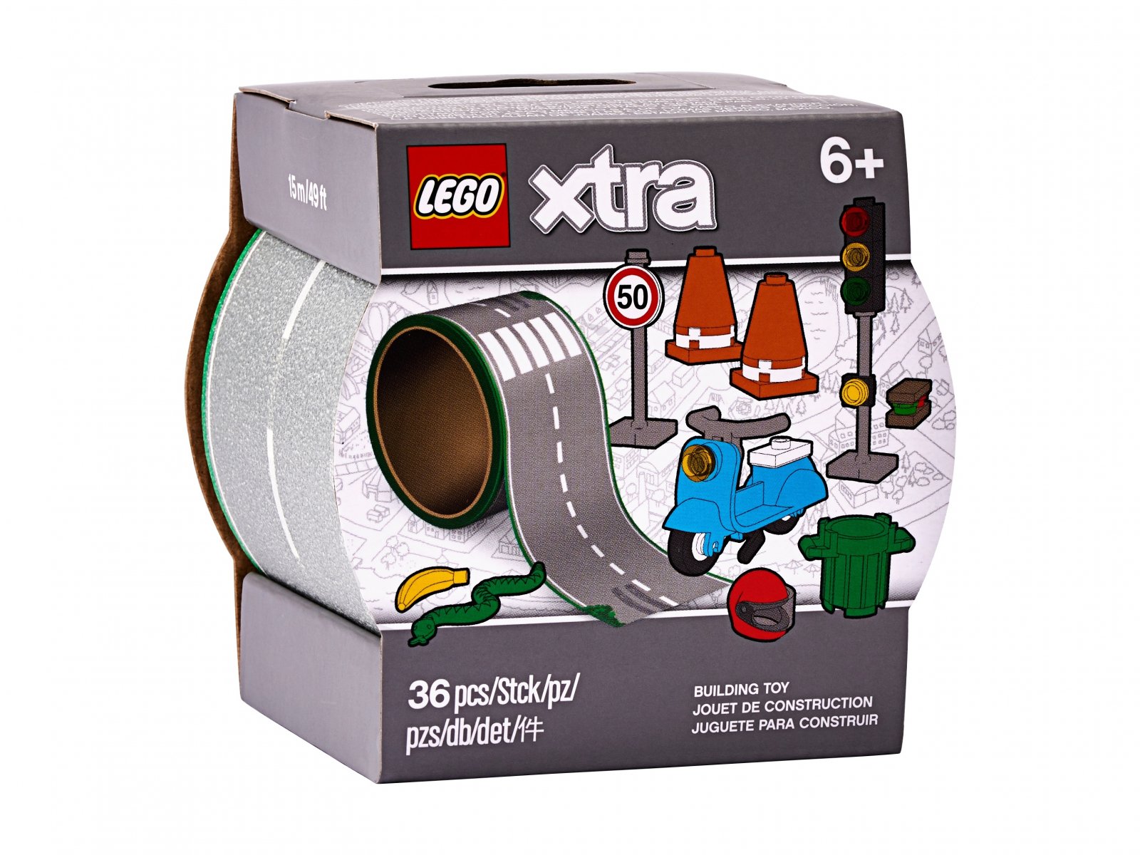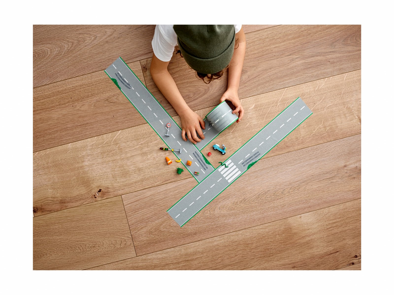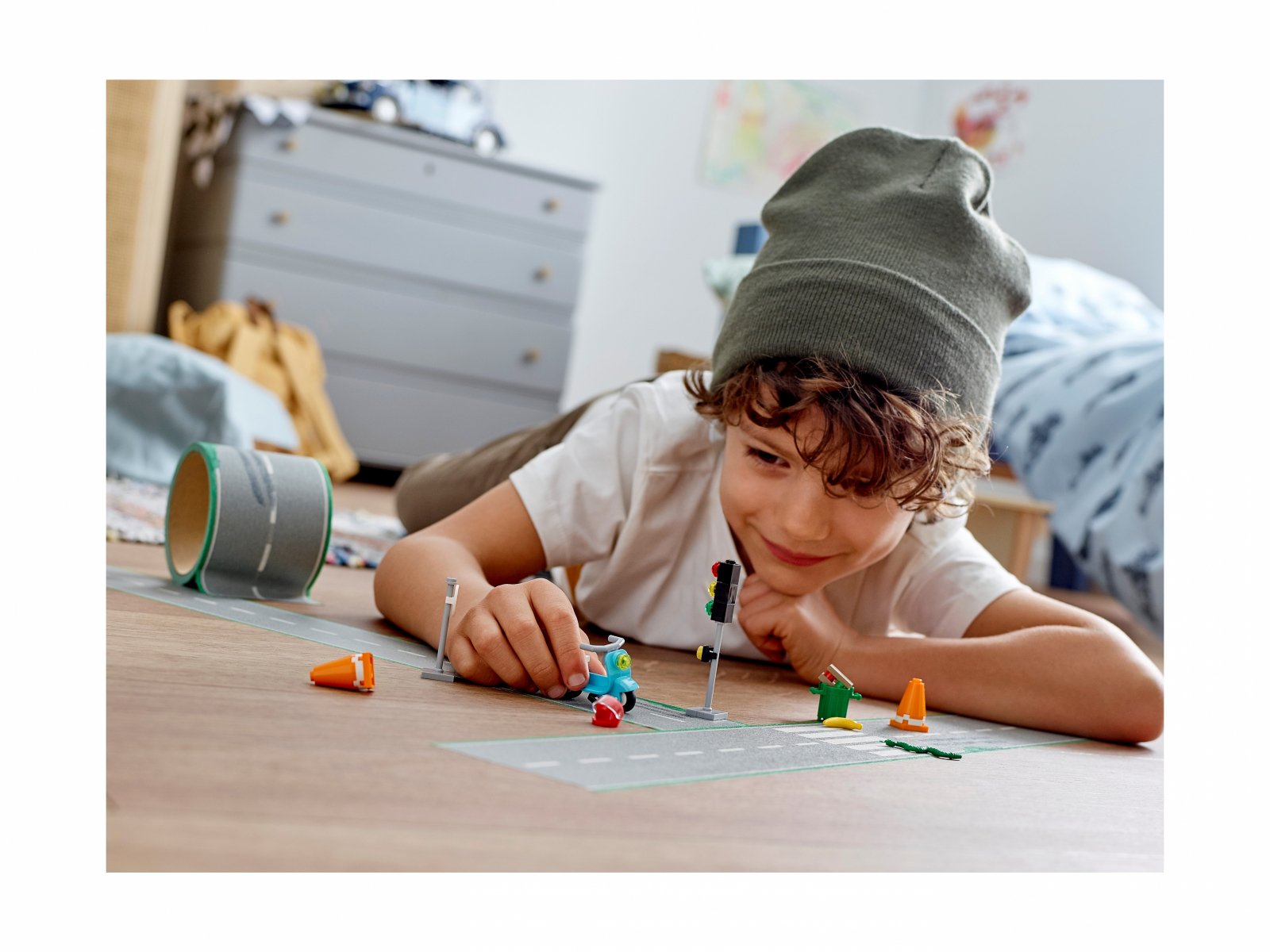 Miłośnikom LEGO® spodoba się urządzanie emocjonujących wyścigów za pomocą zestawu akcesoriów Taśma z drogą (854048). Po rozwinięciu szarej taśmy z pasami drogowymi, śladami opon i fragmentami trawnika dzieci mogą odgrywać na niej ciekawe historie z wykorzystaniem ośmiu akcesoriów, takich jak znak ograniczenia prędkości, pachołki drogowe, światła uliczne i skuter. Zestaw można połączyć z innymi modelami LEGO®, więc dzieci mogą urządzić na taśmie wyścig wszystkich swoich samochodzików.