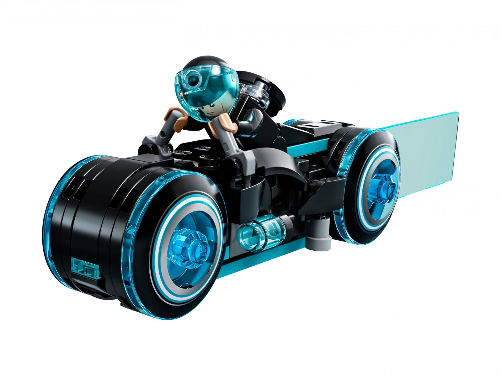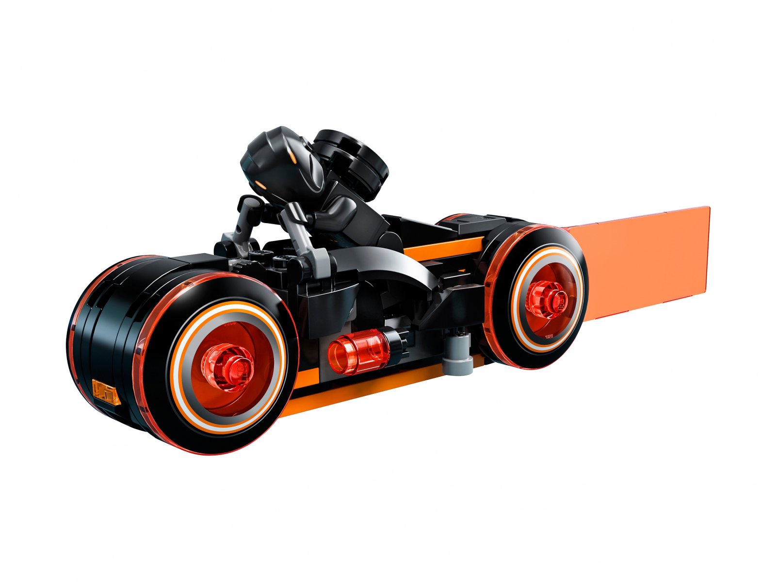 - Światłocykl Sama Flynna ma siedzenie dla minifigurki, autentyczne funkcje i przezroczyste niebieskie klocki przedstawiające światło, w tym także strumień światła, który pojazd zostawia za sobą.