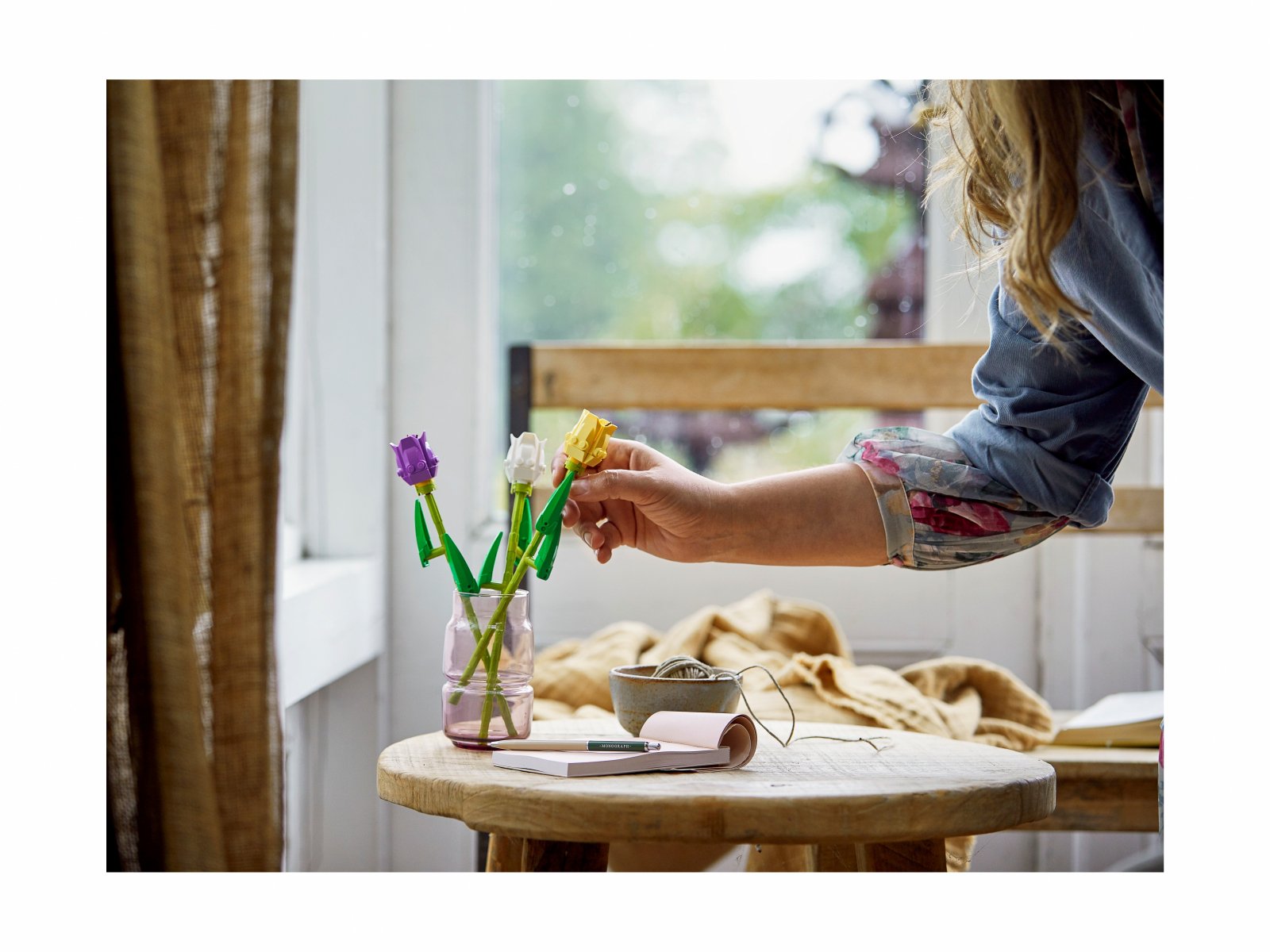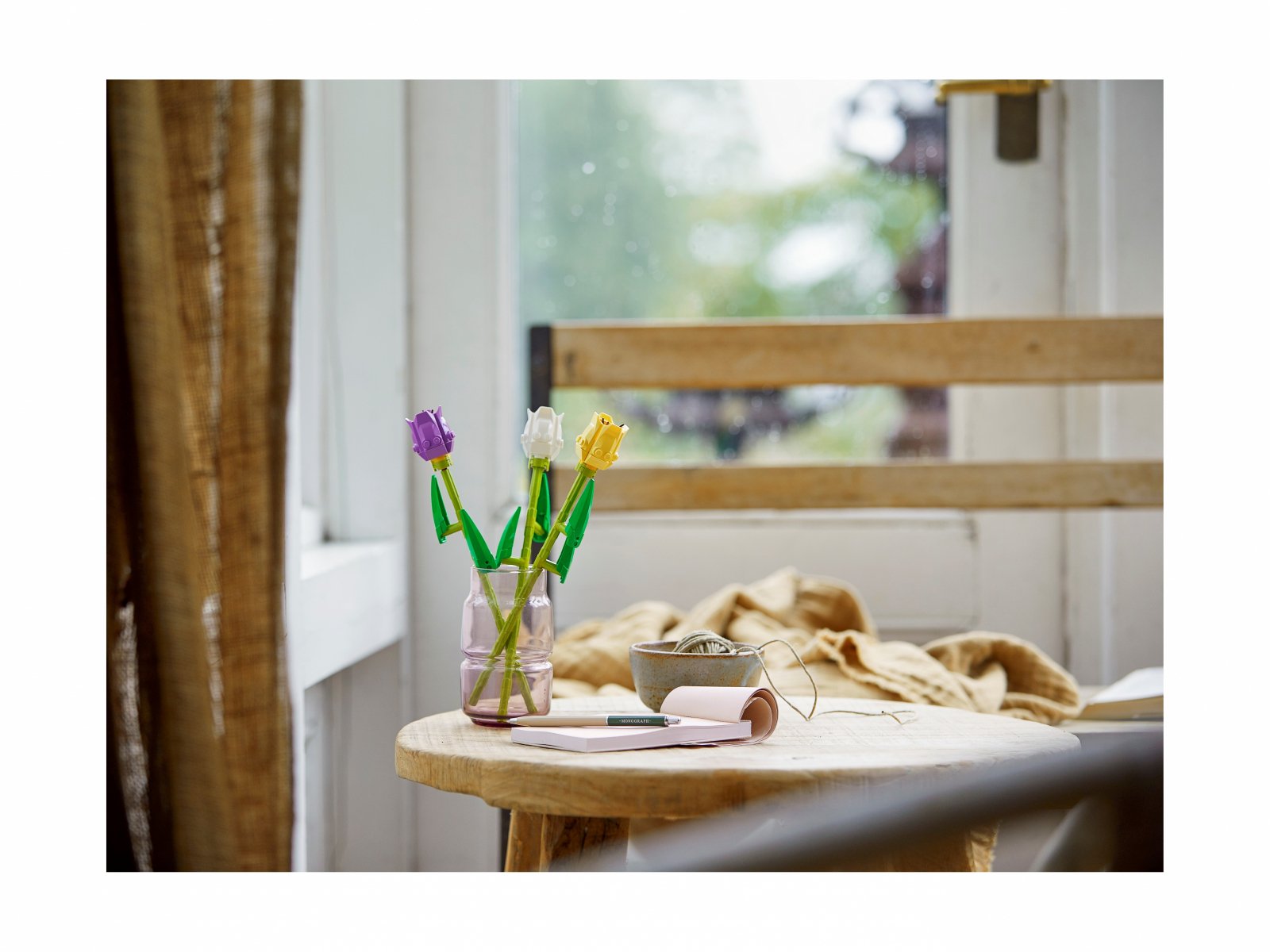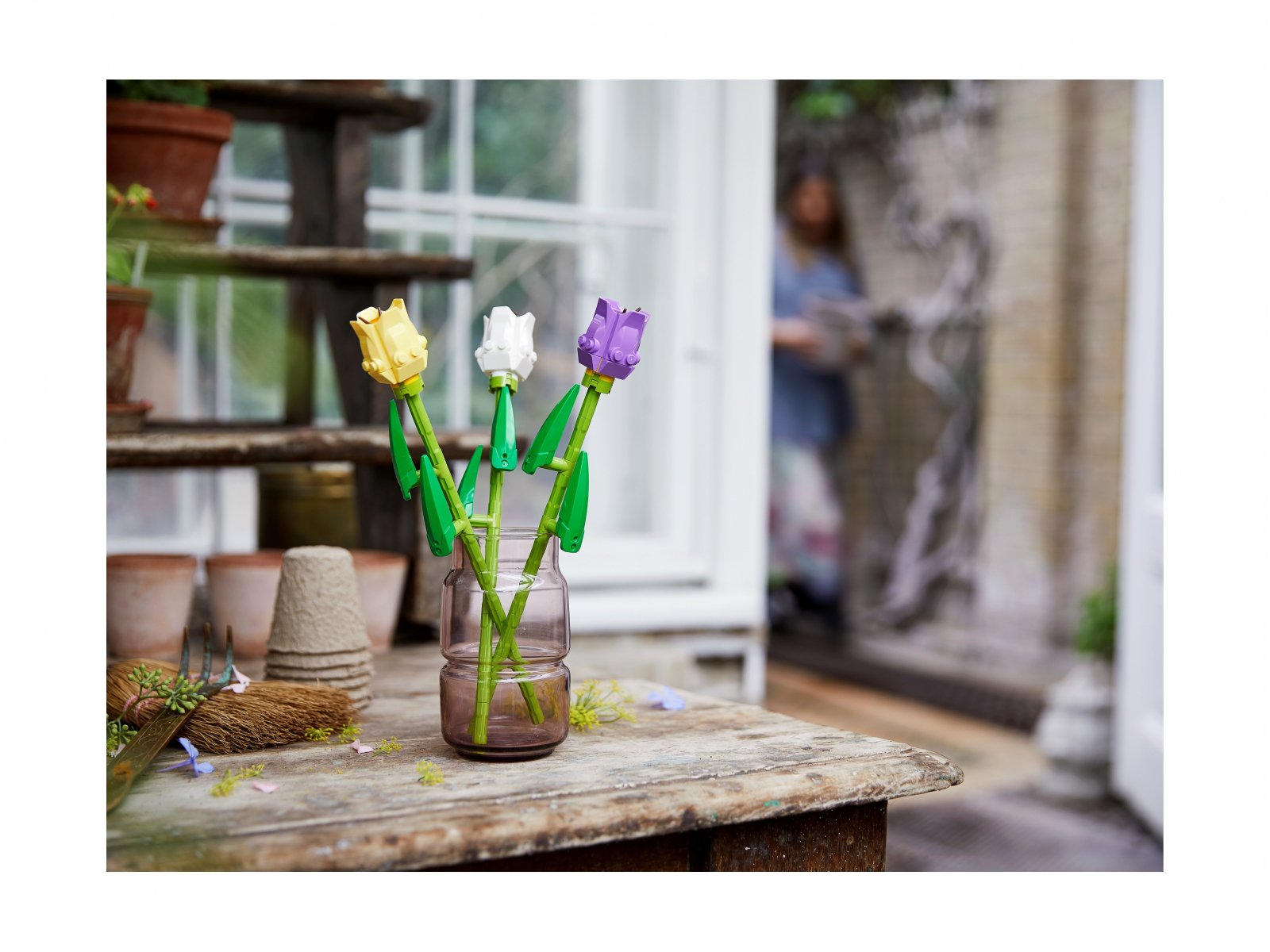 - Zestaw zawiera trzy różnokolorowe tulipany do zbudowania z regulowanymi łodygami.