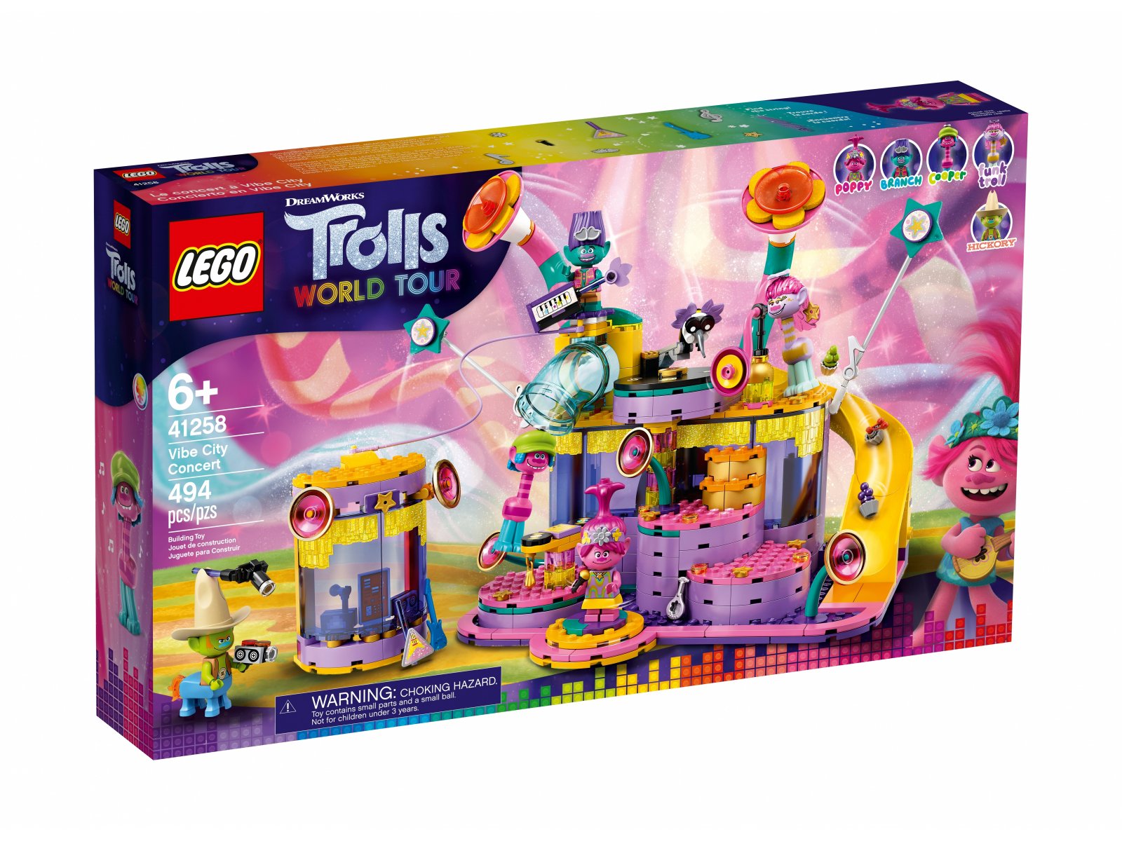 - Pozwól młodym fanom Trolli odkryć cudowny świat muzyki dzięki ciekawemu zestawowi LEGO® Trolls World Tour Vibe City koncert (41258) inspirowanemu filmem „Trolle 2”.