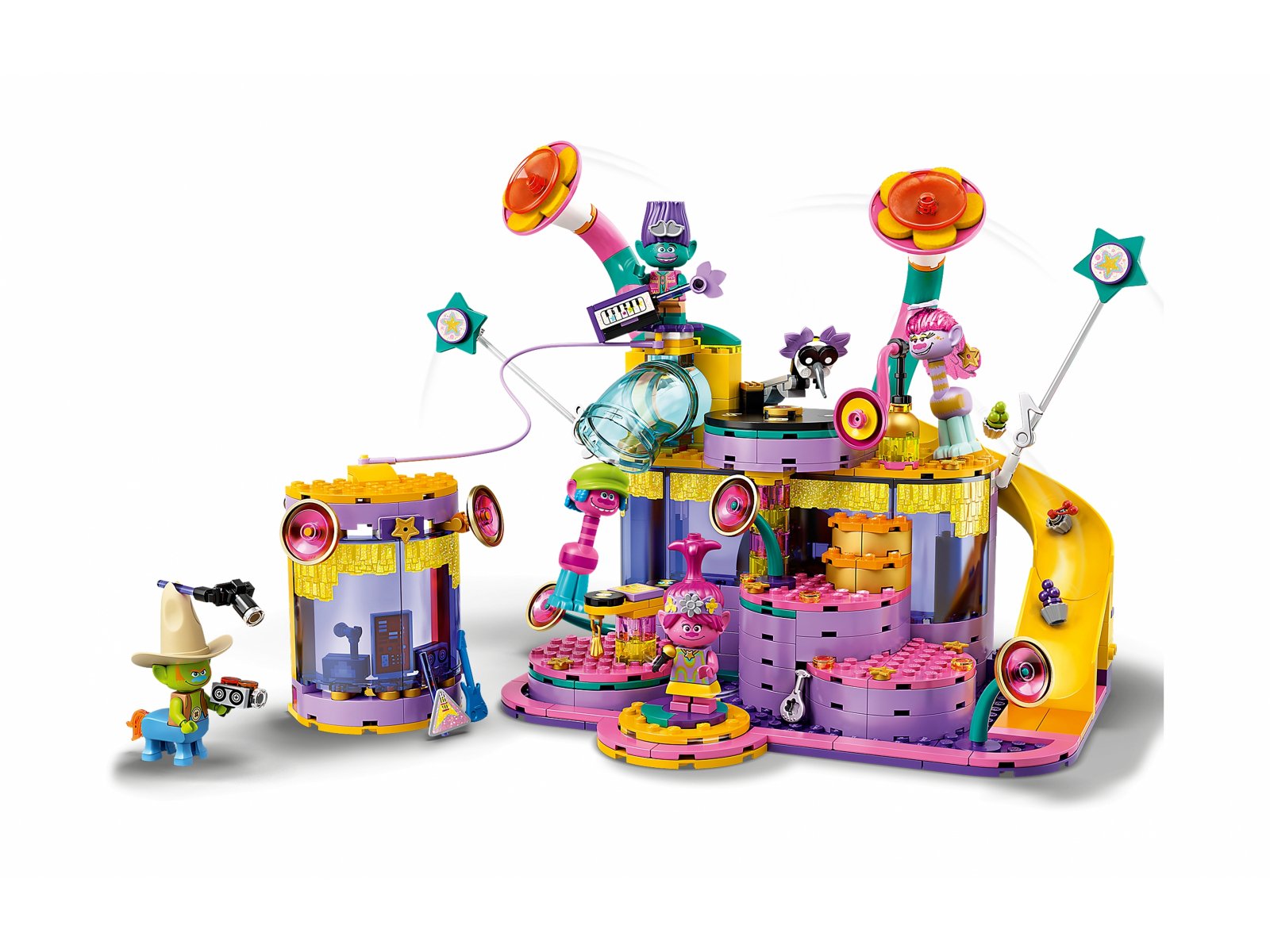Odgrywaj role podczas rozśpiewanych przygód z TrollamiDzieciom spodoba się możliwość odtwarzania zabawnych scen z filmu „Trolle 2”. Pięć minifigurek sprawia, że kreatywna zabawa jest bardzo łatwa. Pozwól Trollom zjechać na zjeżdżalni lub posadź je na obrotowych platformach. Podziwiaj uroczy filcowy głośnik, błyszczące szczegóły i ruchome gwiazdki, a także kolekcjonerską strunę znaną z filmu.