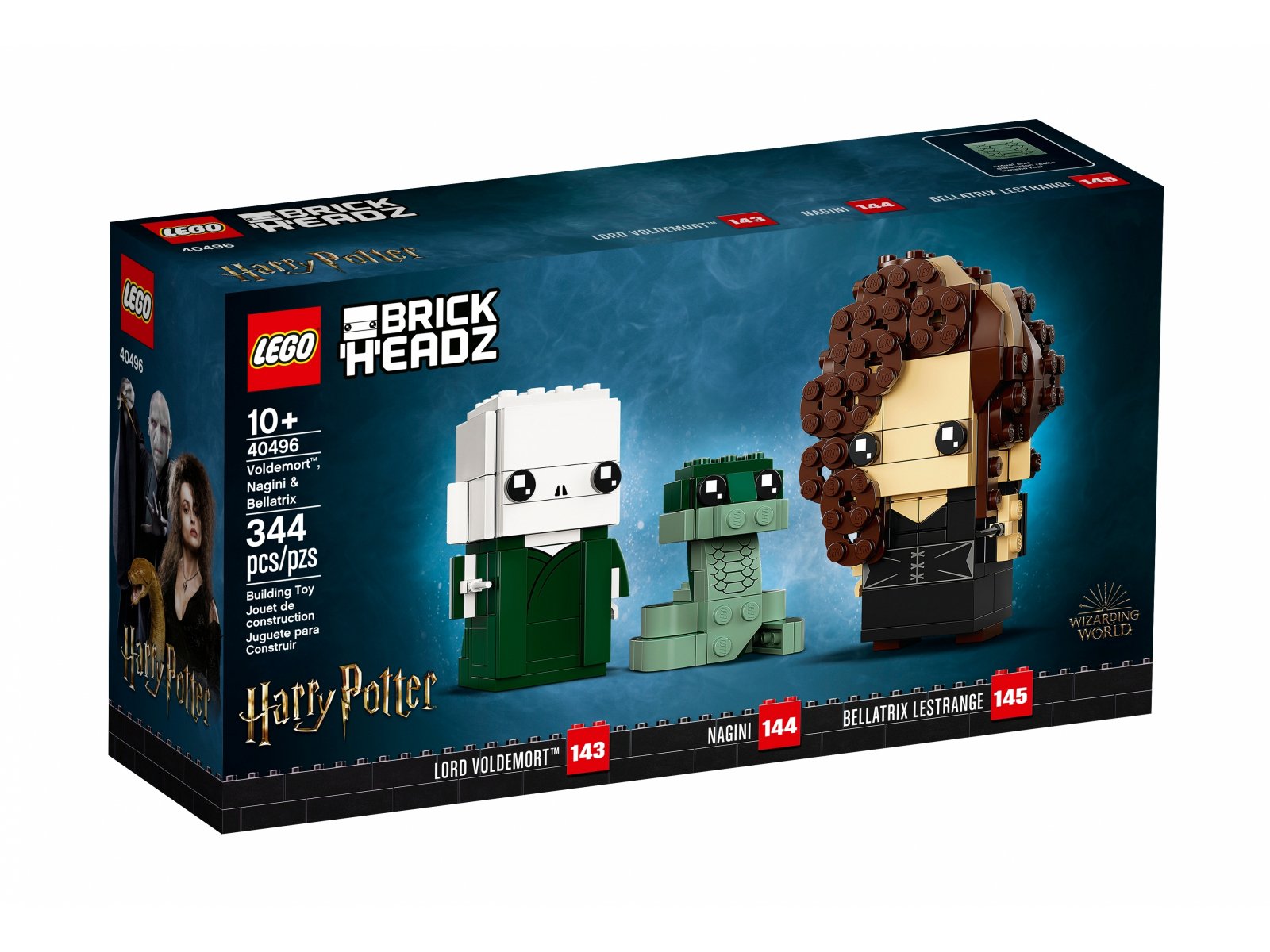 Postacie z filmów o Harrym Potterze jako modele LEGO® BrickHeadz™: złowieszczy Lord Voldemort, jego upiorny wąż Nagini oraz najbardziej oddana zwolenniczka, Bellatrix Lestrange.