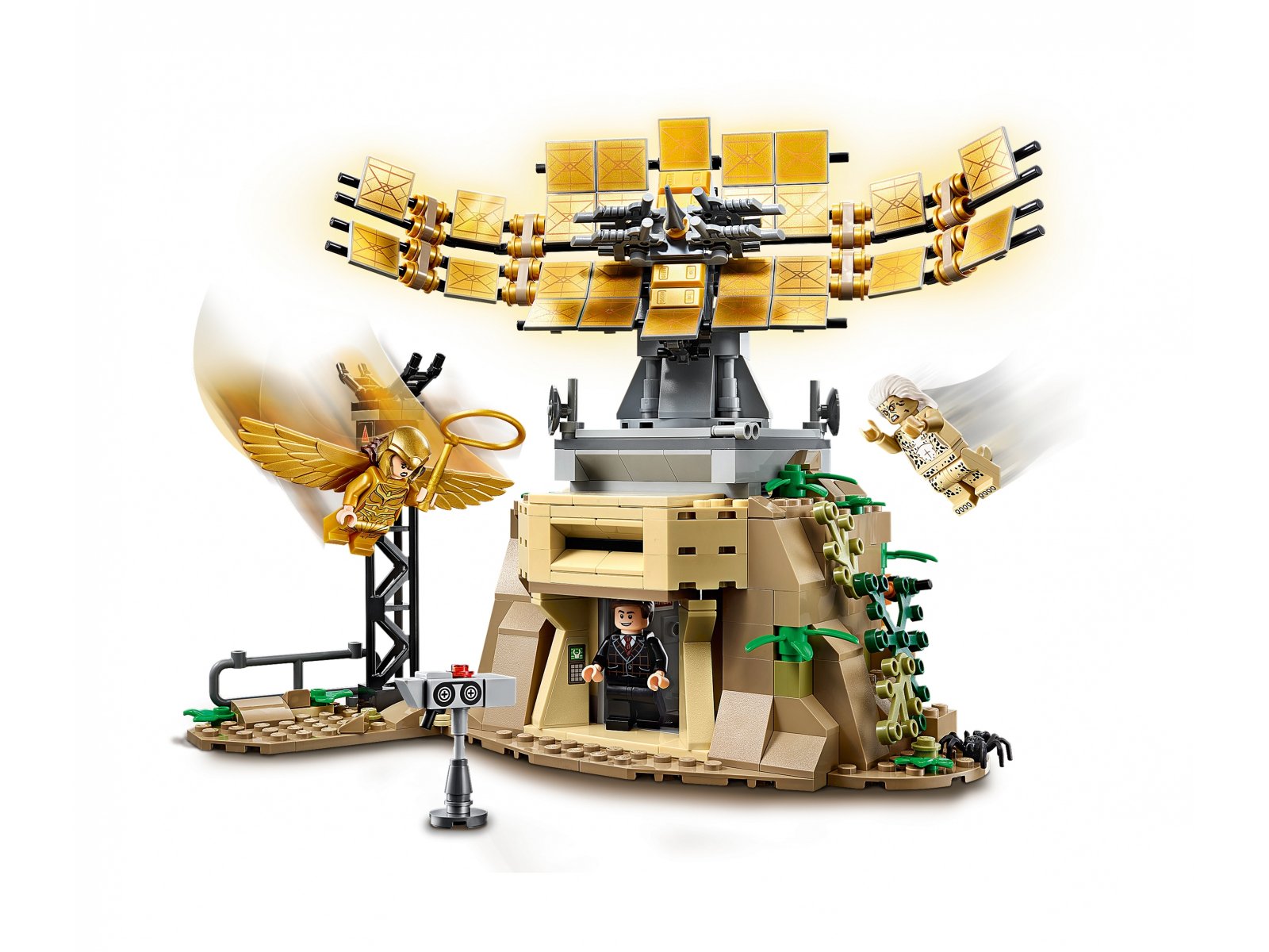 - Minifigurki skrzydlatej Wonder Woman™ i Cheetah zapewniają wystrzałowe sceny akcji, a minifigurka Maxa™ zajmuje miejsce w sterowni. Wysoko nad nim nadajnik na wieży obraca się o 360 stopni i przesuwa w górę i w dół.